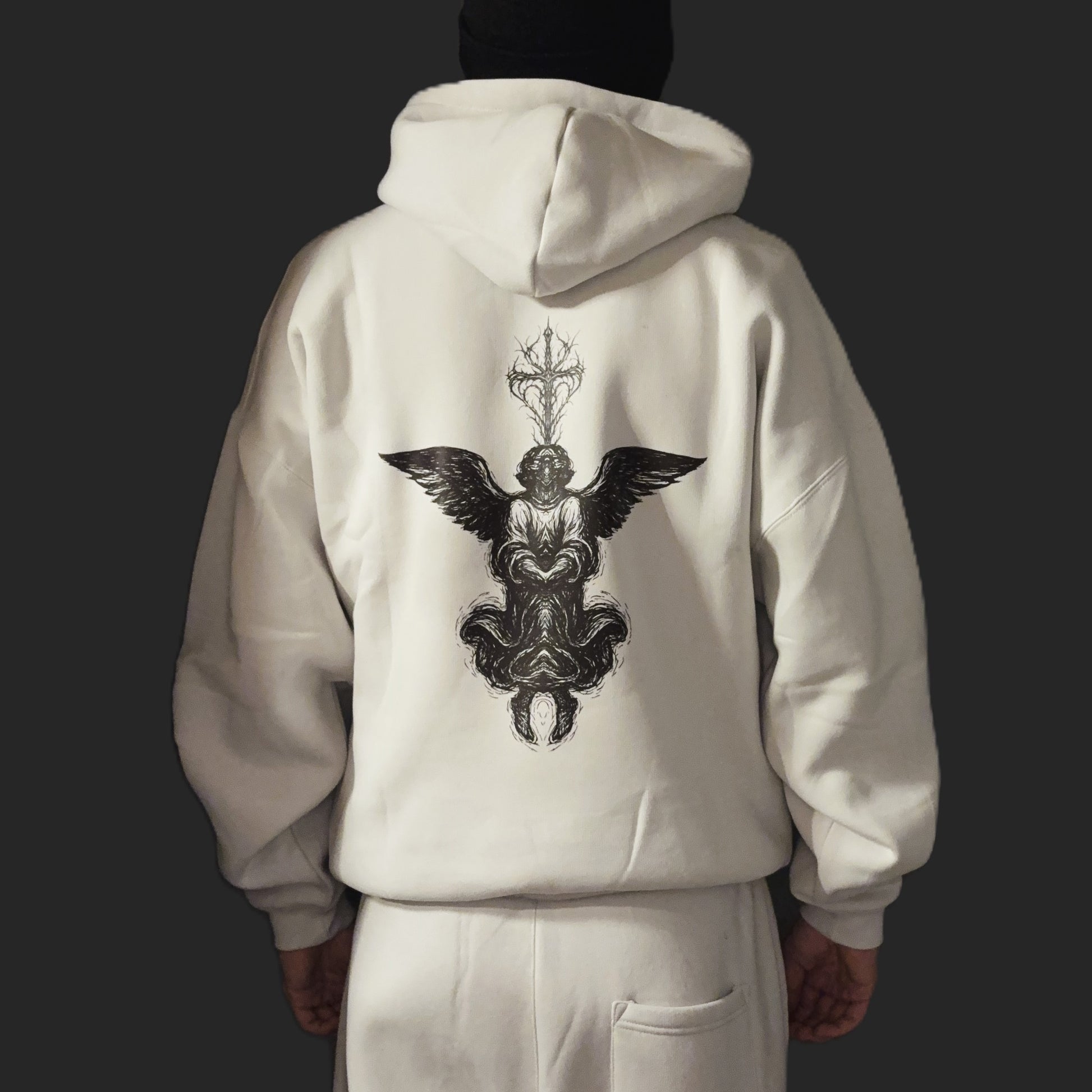 The Angel Mirror Hoodie captures balance, reflection, and faith. A mirrored angels rests beneath a vine-woven cross, symbolizing harmony and duality — strength and peace coexisting in one spirit. A timeless white piece that feels as pure as it looks.